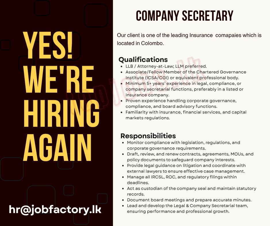 Our client, a leading insurance company located in Colombo, is seeking a highly qualified and experienced Company Secretary to join their team. This role is crucial in ensuring corporate governance, compliance, and legal adherence within the organization.