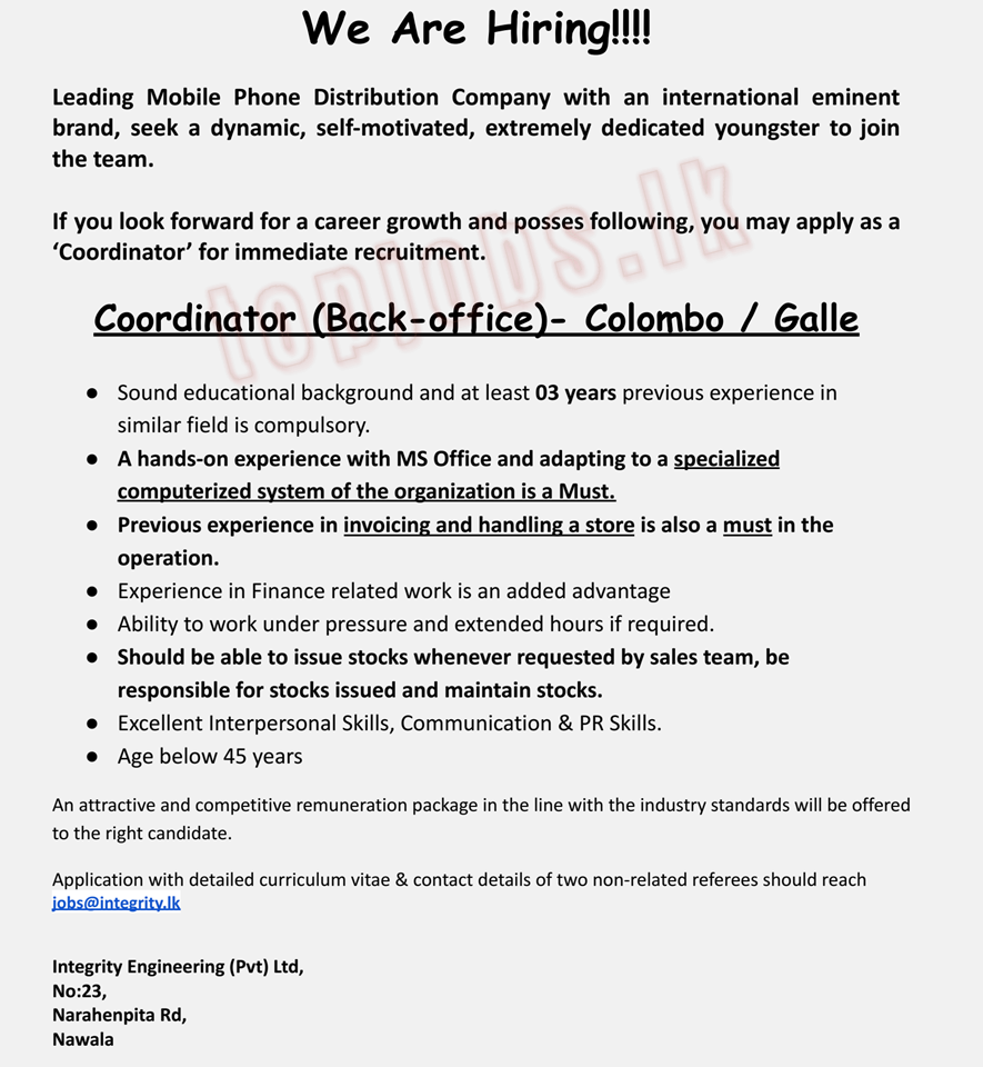 Job Description: A Leading Mobile Phone Distribution Company with an international eminent brand seeks a dynamic, self-motivated, extremely dedicated youngster to join the team. If you look for a career growth and possess the following, you may apply as a ‘Coordinator’ for immediate recruitment.