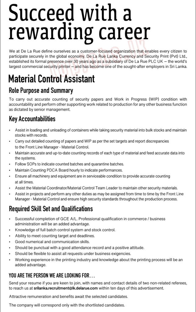 Send your CV along with two non-related referees’ names and contact details of two non-related referees, to reach us at srilanka.recruitment@delarue.com within ten days of this advertisement.