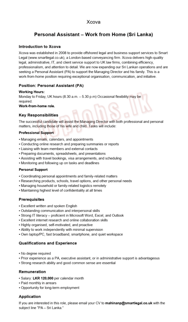 Xcova was established in 2008 in London, UK, to provide offshore legal and business support services to Smart Legal (www.smartlegal.co.uk), a London-based conveyancing firm. Xcova delivers high-quality legal, administrative, IT, and client service support to UK law firms, combining efficiency, professionalism, and attention to detail. We are now expanding our Sri Lankan operations and are seeking a Personal Assistant (PA) to support the Managing Director and his family. This is a work-from-home position requiring exceptional organisation, communication, and initiative.