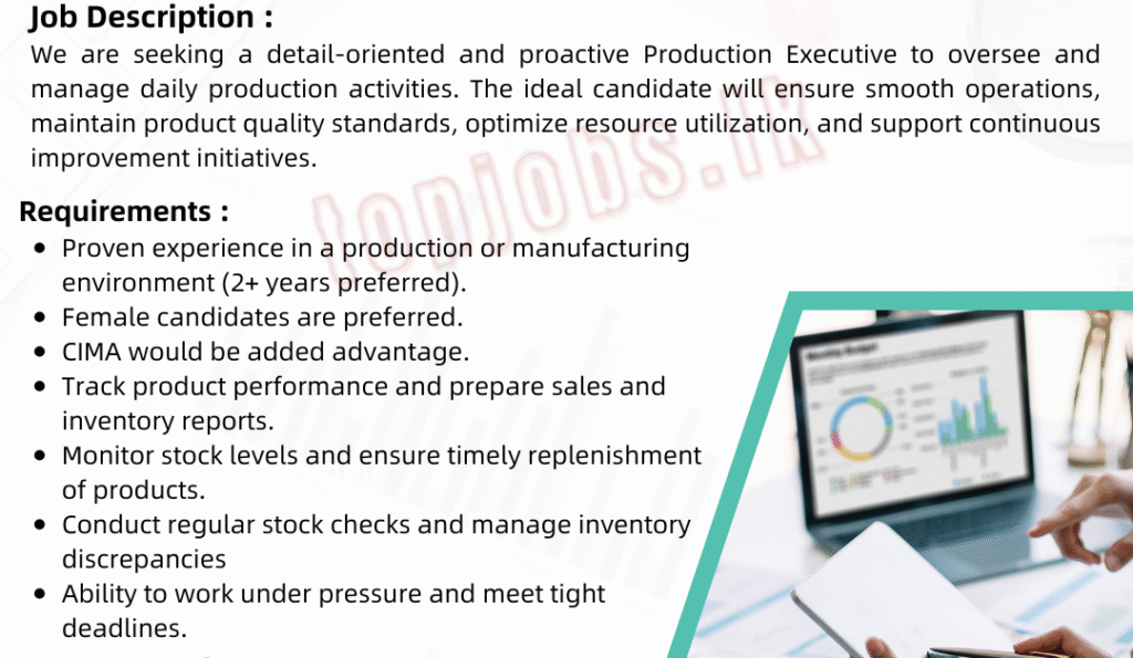 Micronet Global Service (pvt) Ltd is seeking a detail-oriented and proactive Production Executive to oversee and manage daily production activities. The ideal candidate will ensure smooth operations, maintain product quality standards, optimize resource utilization, and support continuous improvement initiatives.