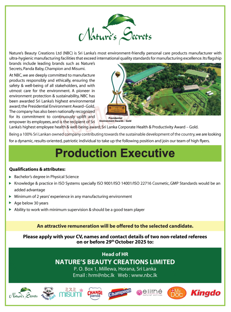 Company Profile: Nature’s Beauty Creations (NBC) is Sri Lanka’s most environment-friendly personal care products manufacturer with ultra-hygienic manufacturing facilities that exceed international quality standards. Its flagship brands include Nature’s Secrets, Panda Baby, Champion, and Misumi. NBC is deeply committed to sustainable practices and has received numerous awards, including Sri Lanka’s highest environmental award, the Presidential Environmental Award—Gold. The company is nationally recognized for its commitment to continuously uplift and enrich its employees.