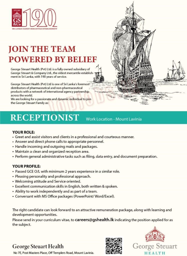 George Steuart Health (Pvt) Ltd, one of Sri Lanka’s foremost distributors of pharmaceutical and non-pharmaceutical products with a network of international agency partnership across the world, is looking for a passionate and dynamic individual to join the George Steuart Family as a Receptionist. Join our team, powered by belief!