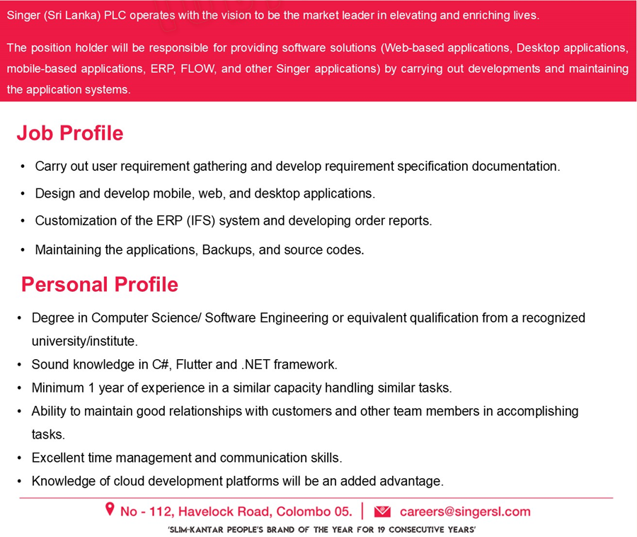 The position holder will be responsible for providing software solutions (Web-based applications, Desktop applications, mobile-based applications, ERP, FLOW, and other Singer applications) by carrying out developments and maintaining the application systems.